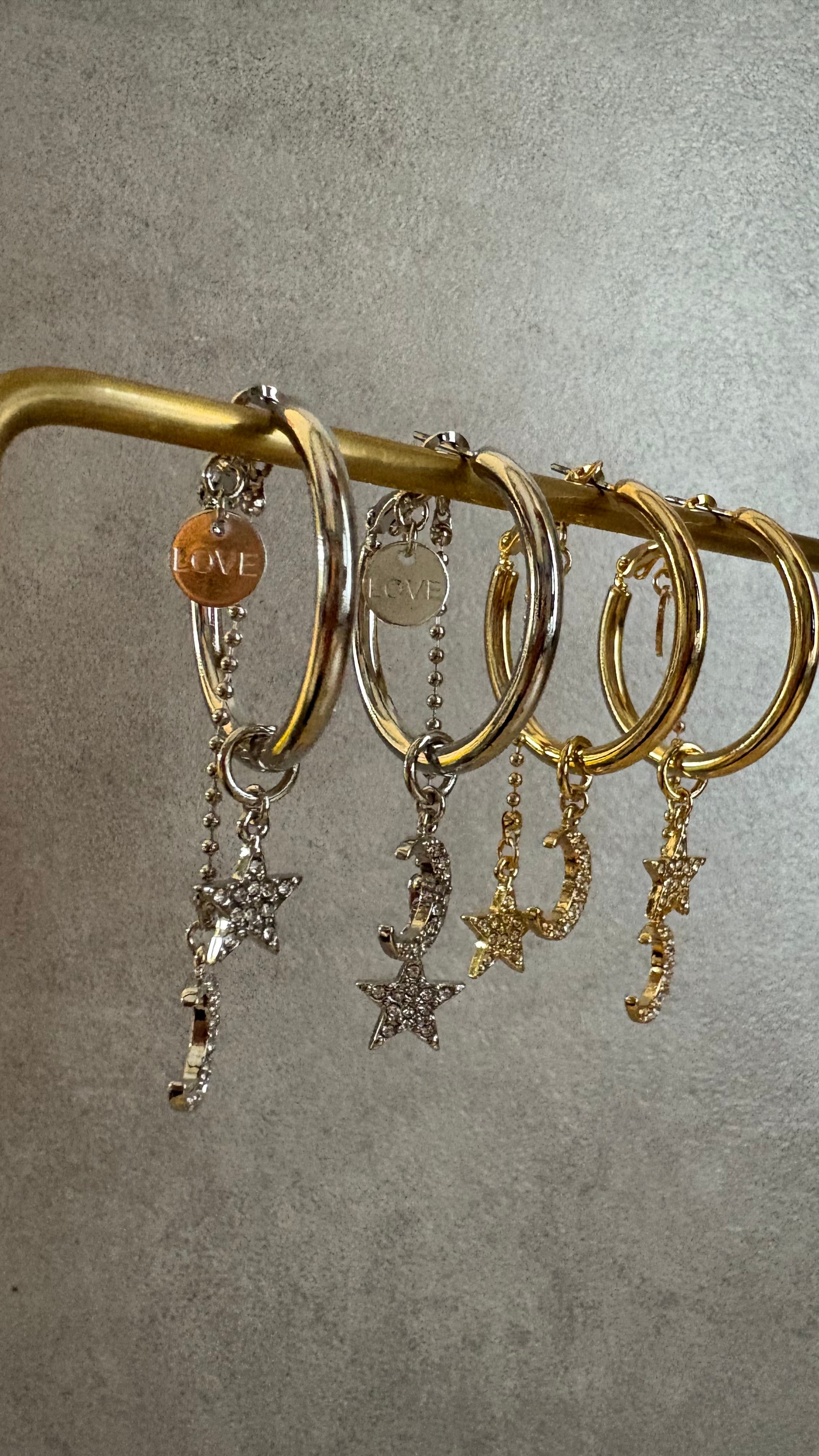 星と月のチャームが揺れるデザインピアス
