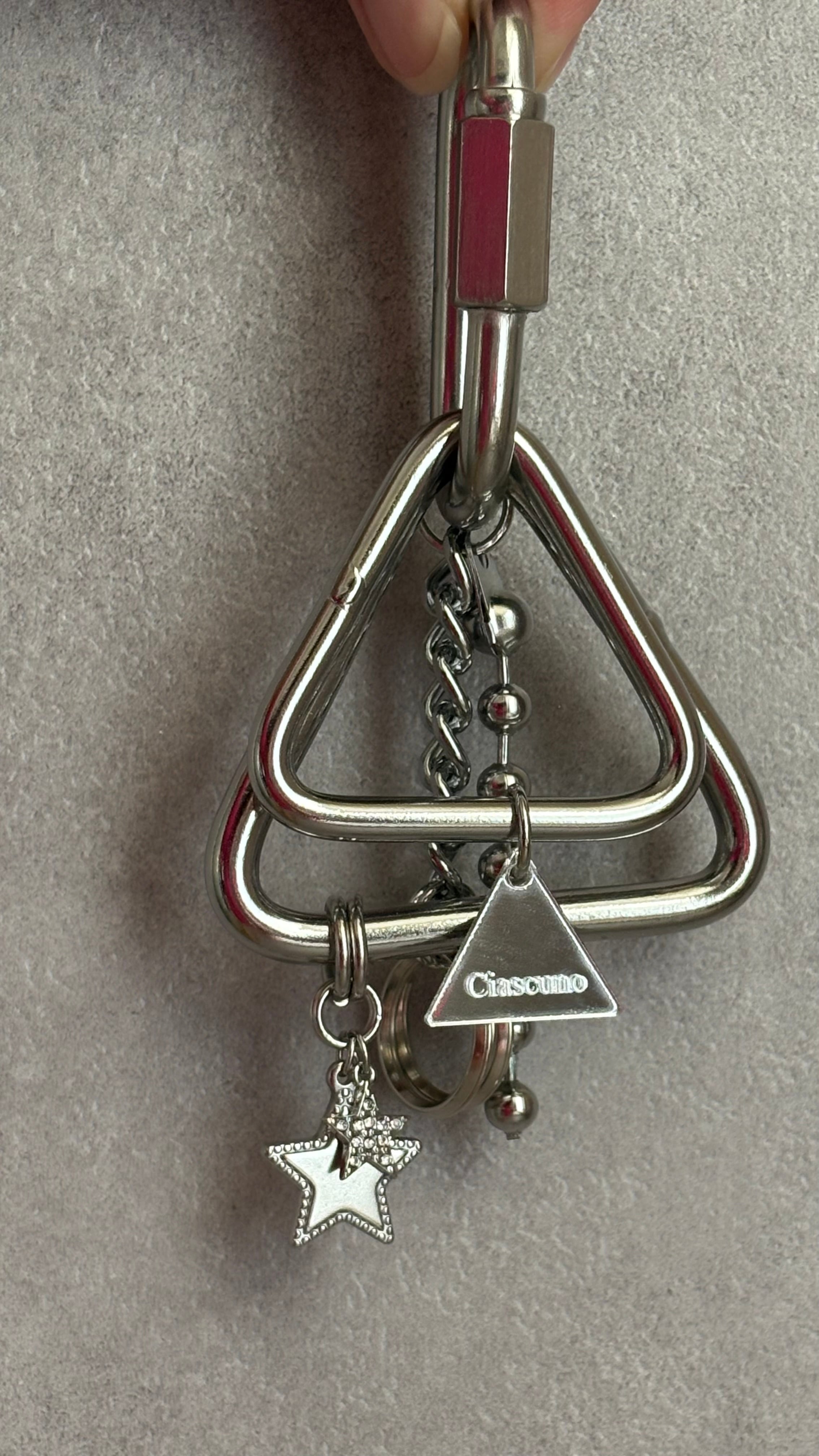 シンプルでありながら、遊び心を感じさせる三角形のデザインが魅力のキーリングです。