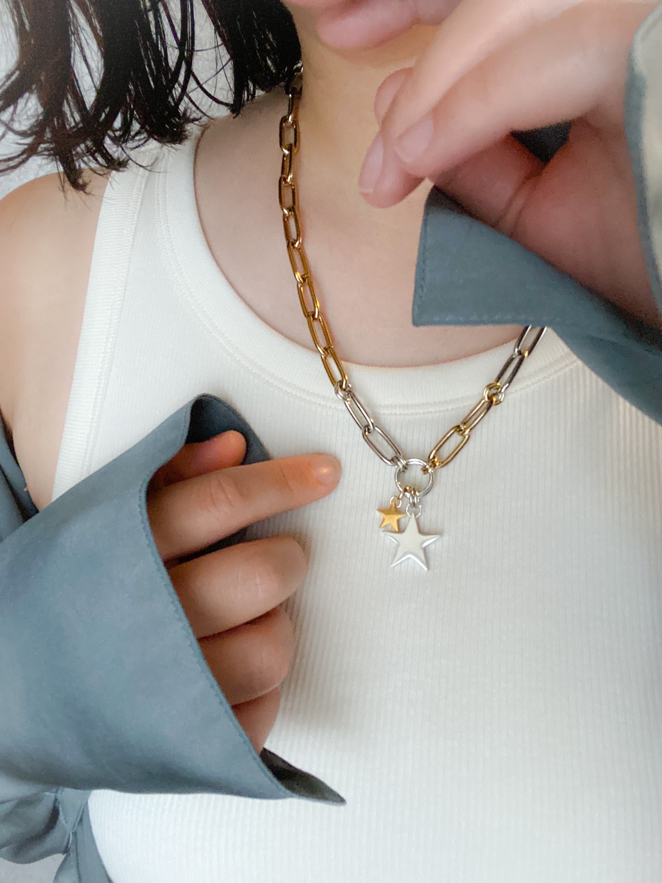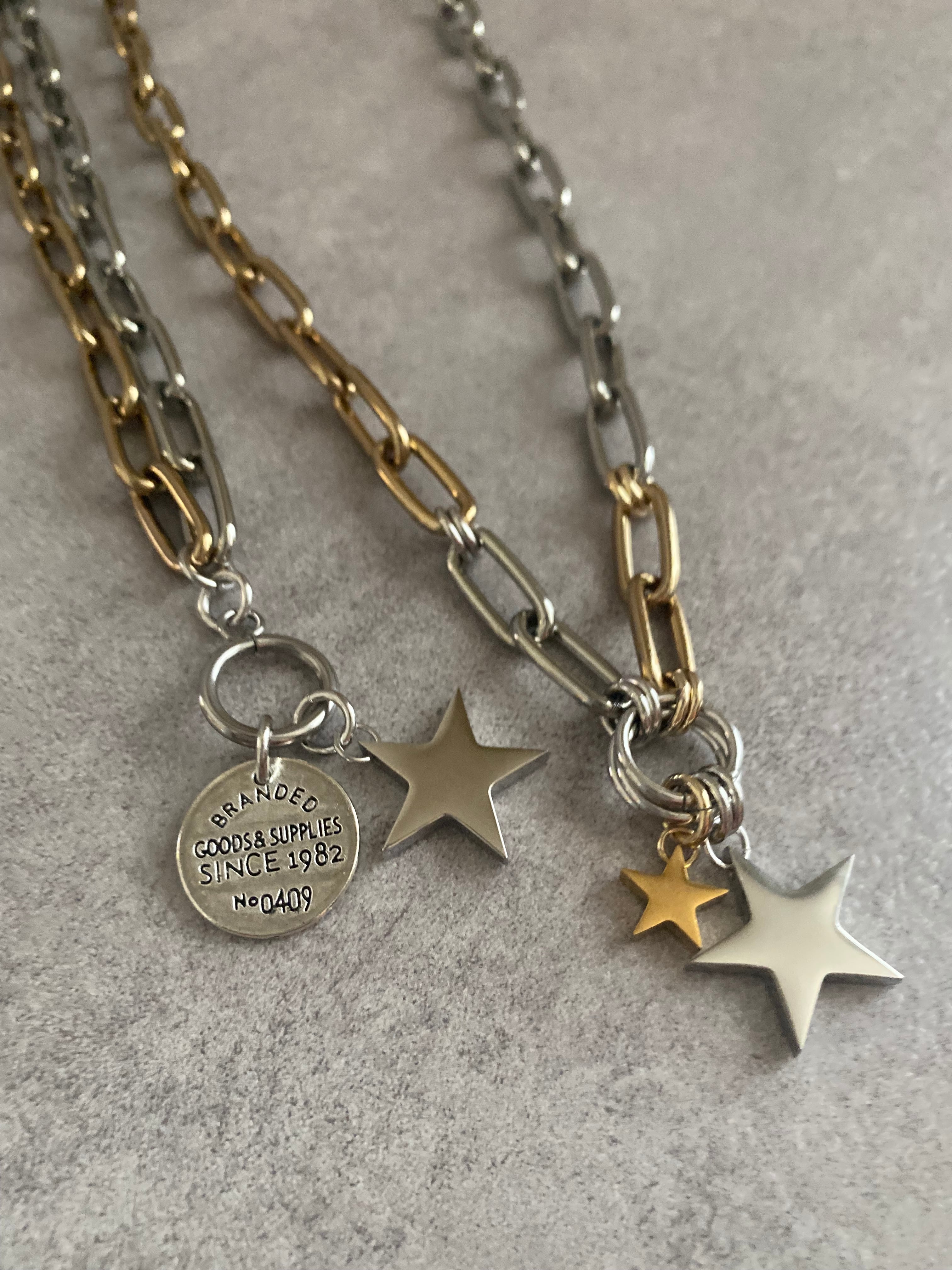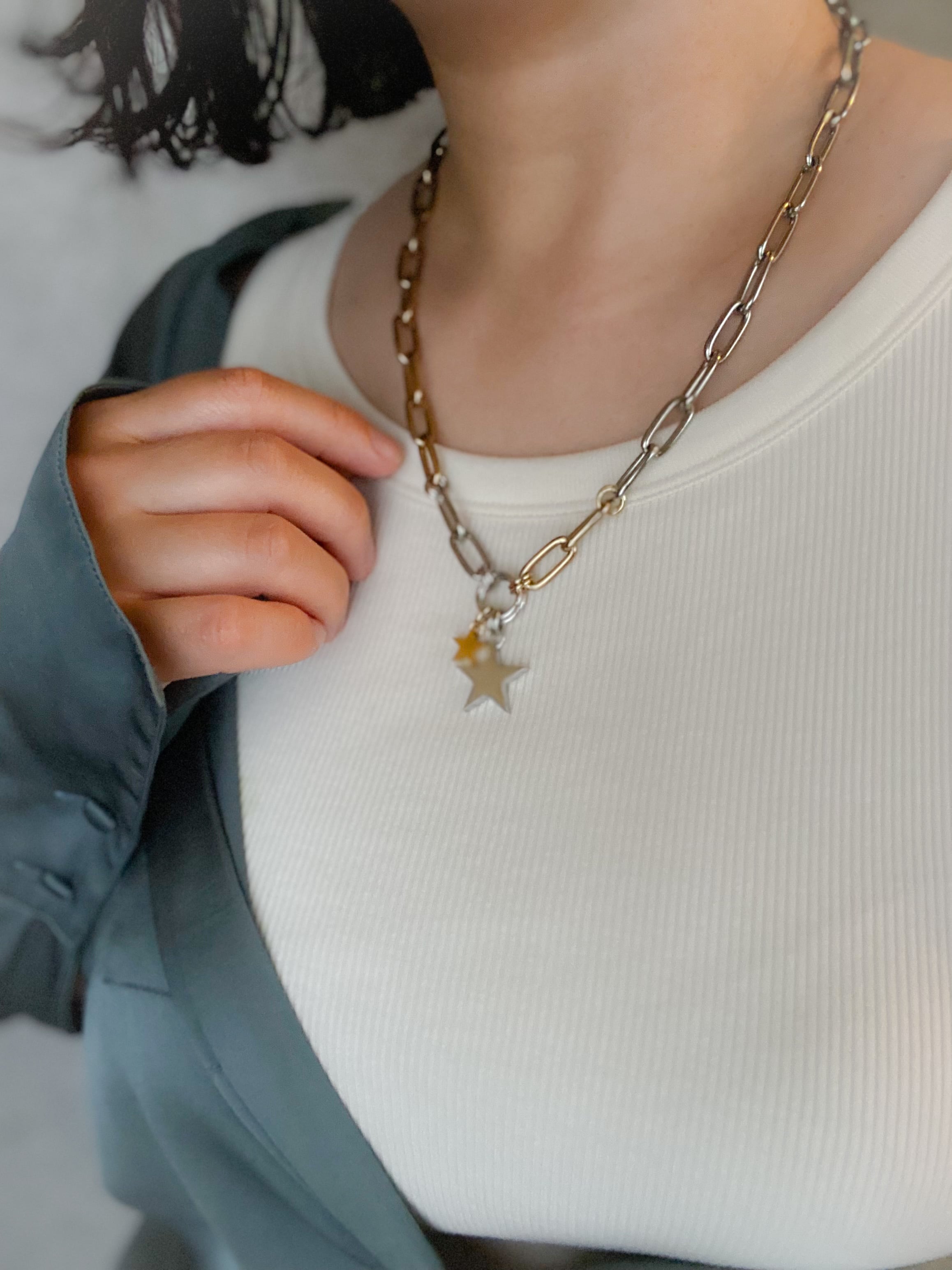 シルバーカラー×ゴールドカラーがMIXになったボリューム感のあるネックレスです✨